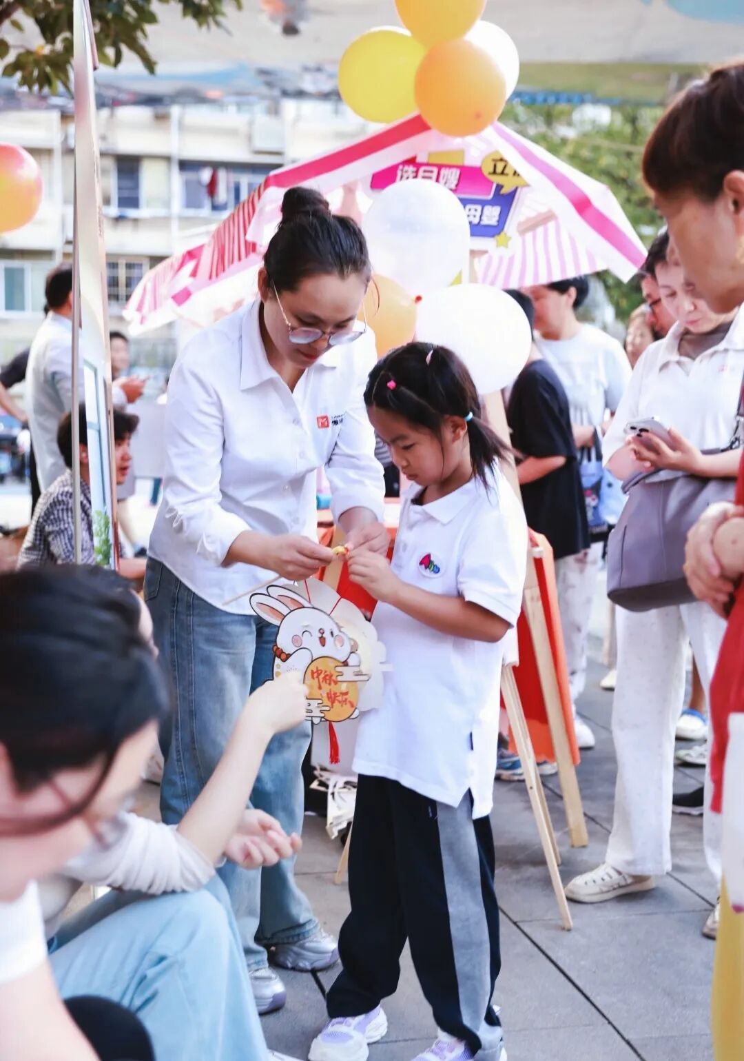 在懒猫母婴的活动区域,一场温馨的DIY兔子灯制作活动正悄然进行。魏老师带着家长孩子围坐在一起,专注认真地拼贴、组装,制作属于自己的一盏“团圆月”。
