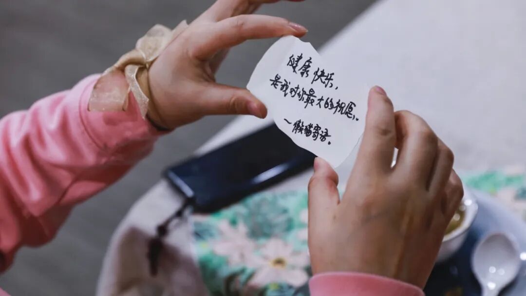 在轻柔的音乐中,阿姨们提笔写信——给家人、客户,或未来的自己。其中一位阿姨写下的寄语格外打动人心:"对自己要随心,对他人要随缘,看自己的风景,走自己的路,念别人的好,修自己的心,一切想开看淡,余生很贵,健康最重要。好好爱自己,更要管理好自己的情绪,才能更好的爱家人。"