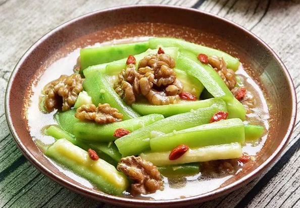 原料:丝瓜250g,核桃仁60g,生姜6g,麻油、盐少量。
