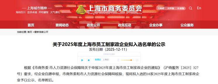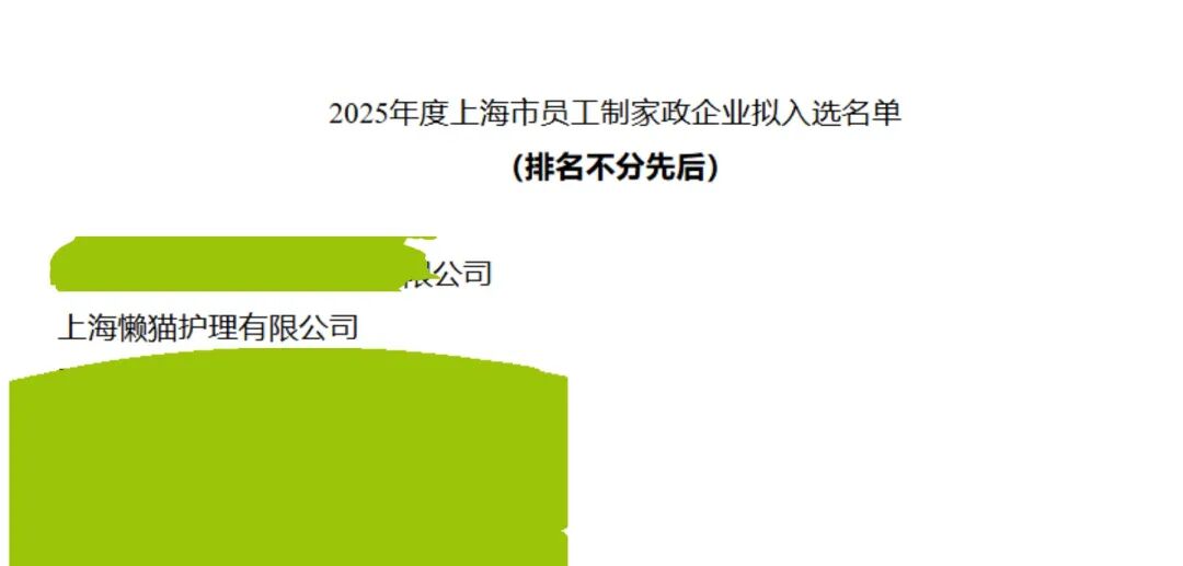 “2025年度上海市员工制家政企业拟入选名单”正在公示。在拟入选的16家企业中,懒猫母婴的名字赫然在列。